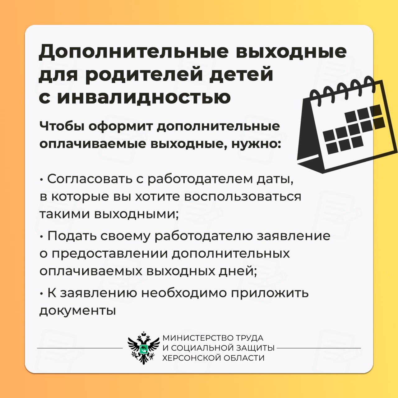 Мама или папа, опекун или попечитель ребёнка с инвалидностью имеют право на 4 дополнительных оплачиваемых выходных дня в месяц.