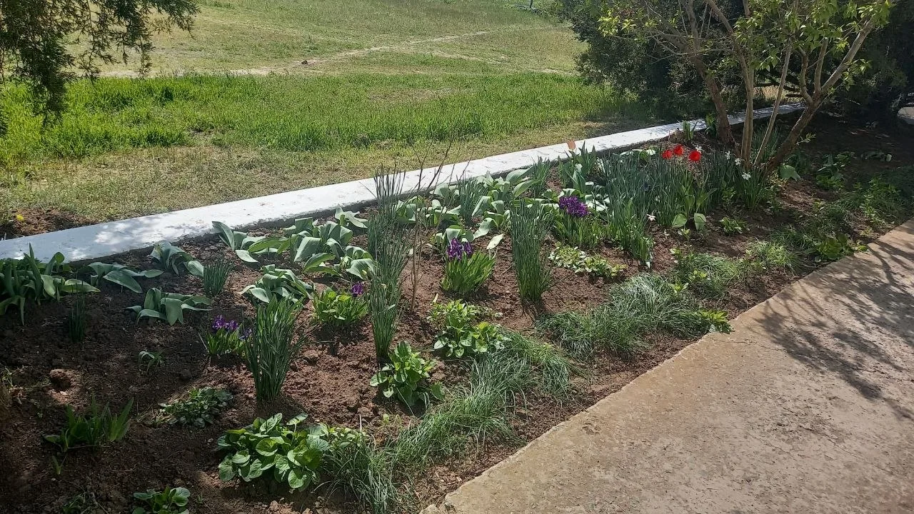 "Чистая дорожка, ухоженный газон и первые весенние цветы радуют взгляд",