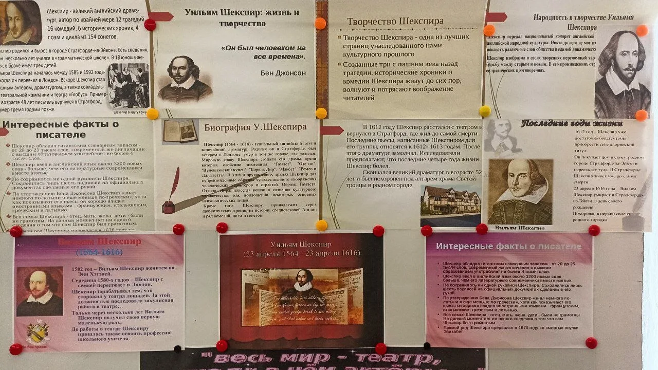 Посетители могут познакомиться с интересными фактами из жизни Шекспира, его творчеством и известными цитатами великого гения литературы.