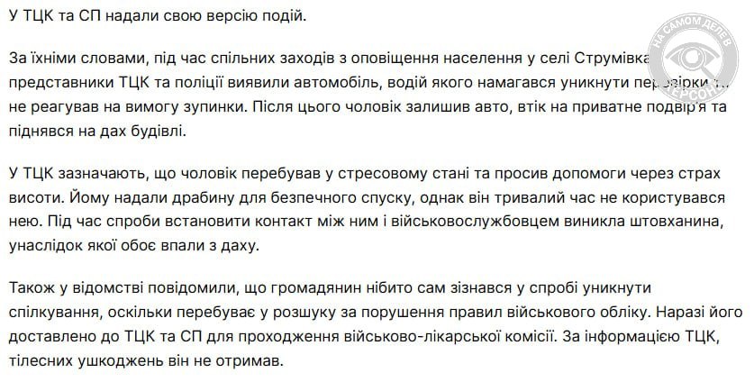 После публикации кадров насильственной мобилизации с крыши дома представители ТЦК поспешили поделиться своей версией произошедшего.