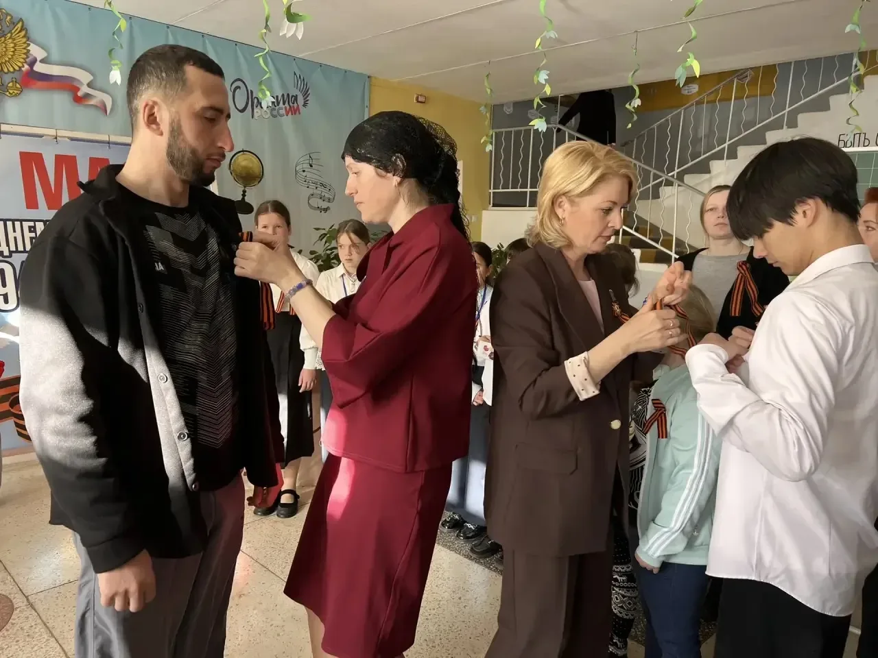 Ученики и учителя с гордостью прикрепили к одежде символ Победы — георгиевские ленты, которые знаменуют великий подвиг нашего народа в годы Великой Отечественной войны и являются знаком памяти, уважения и безграничной благодарности героям.