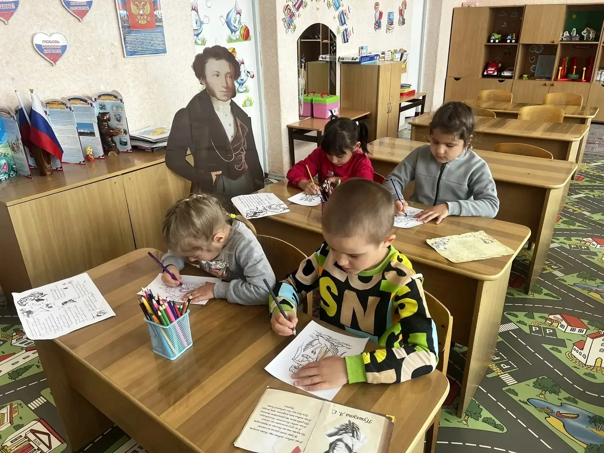 Для воспитанников сада прошло открытое занятие, посвящённое творчеству Александра Сергеевича Пушкина, на котором ребята: