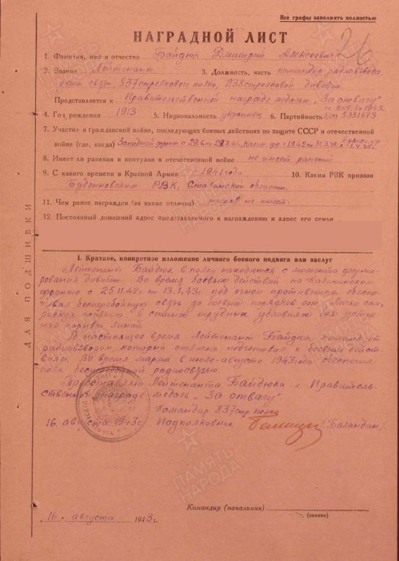 Лейтенант Байдюк находился в полку с момента формирования дивизии. Во время боевых действий на Калининском фронте, с 25 ноября 1942 года по 13 января 1943 года, он обеспечивал бесперебойную связь под огнем противника. Лично устраняя порывы линий связи, он рисковал своей жизнью в самых трудных условиях боя. В настоящее время лейтенант Байдюк командует радиовзводом, который он отлично подготовил к боевым действиям. Во время марша в июле-августе 1943 года он обеспечил полк бесперебойной радиосвязью.