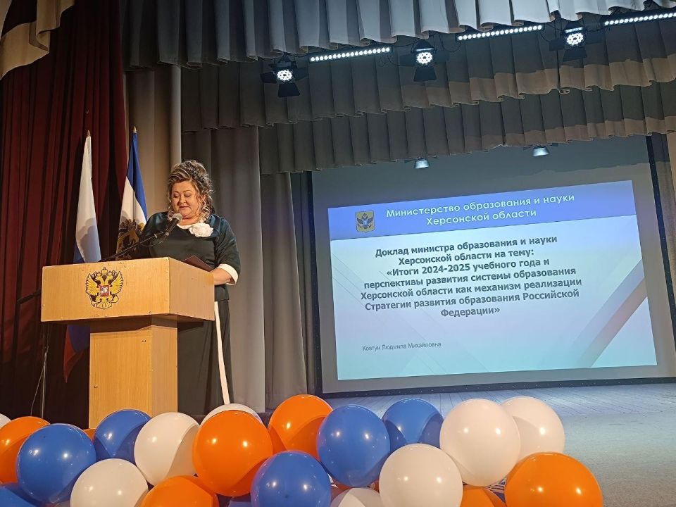 Министр образования и науки Херсонской области Людмила Ковтун поприветствовала участников совещания и выступила с докладом на тему: «Итоги 2025-2026 учебного года и перспективы развития системы образования Херсонской области как механизм реализации Стратегии развития образования Российской Федерации».