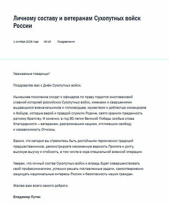 Путин поздравил военнослужащих и ветеранов с Днем Сухопутных войск.