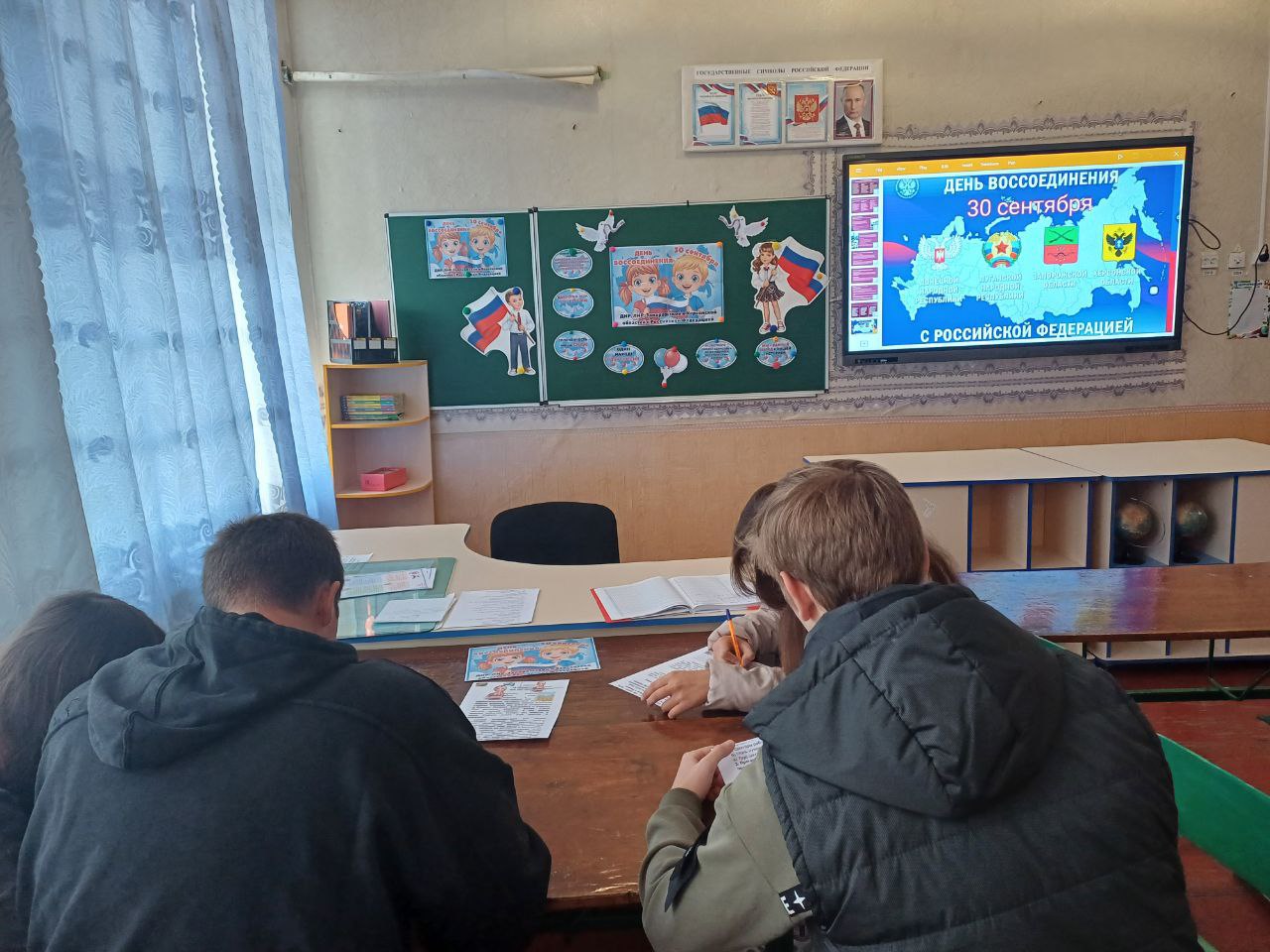 Для обучающихся ГБОУ ХО "Новоалександровская школа Нижнесерогозского района" прошёл урок патриотизма "Спасибо, что мы вместе", приуроченный к воссоединению Донецкой, Луганской, Запорожской и Херсонской областей с Россией.