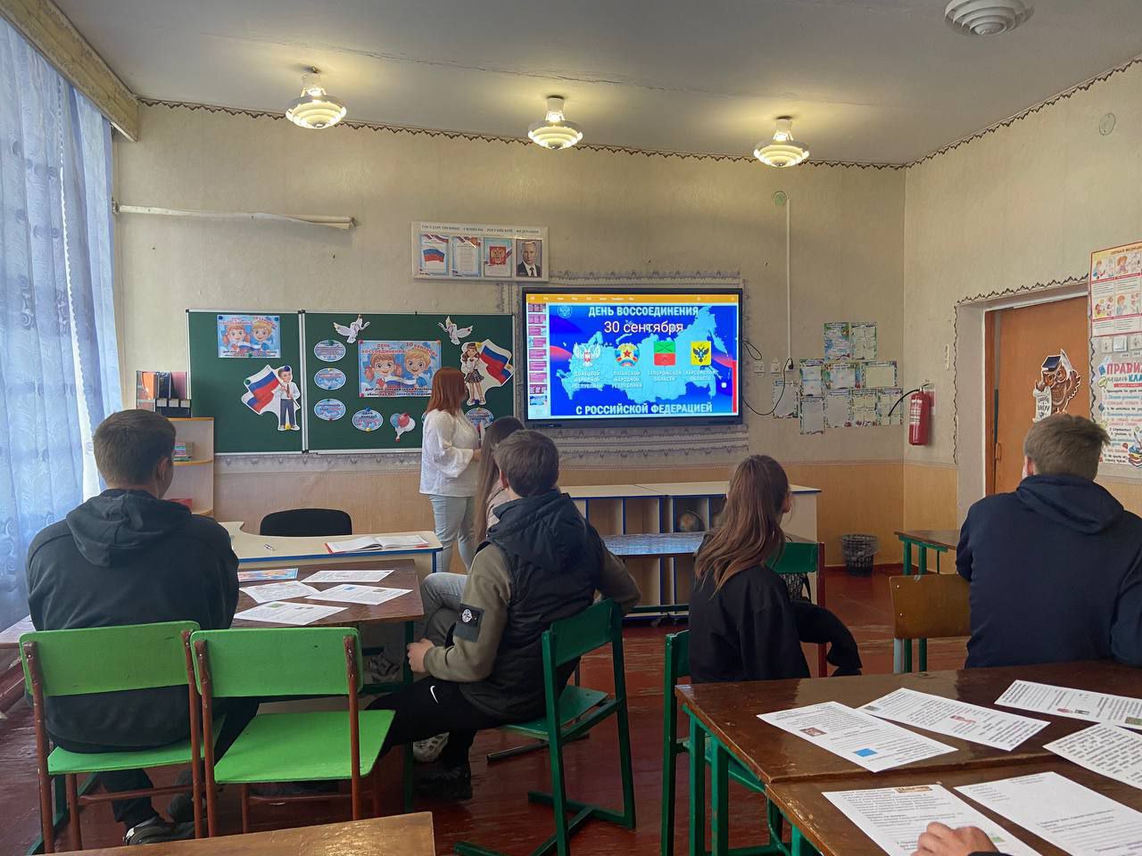 Классный руководитель 10-го класса, Анжелика Пономарёва , рассказала о последних годах, референдумах 2022 и подписании договоров о вхождении новых субъектов в РФ. В финале ребята выполнили задания на рабочем листе "В путешествие с Зоряной", что способствовало закреплению знаний.