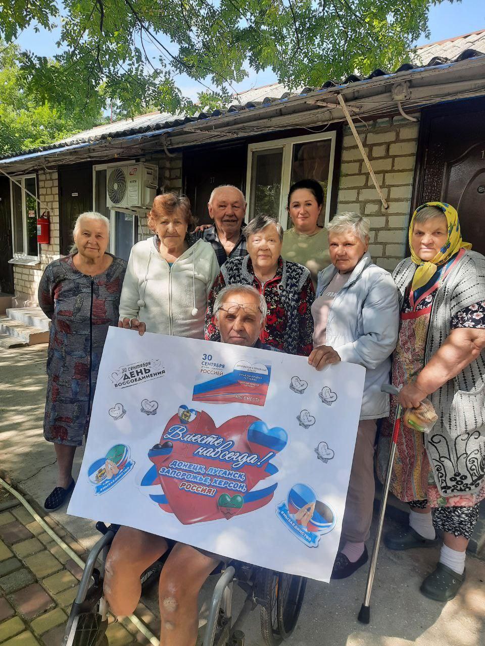 •Каховский гериатрический пансионат: совместно с инструктором по труду создали коллективную стенгазету культурного наследия посвщенную Дню воссоединения. Стенгазету оформили рисунками и коллажами, отражающими историческое значение события, ценность единства и перспективы развития регионов в составе Российской Федерации.