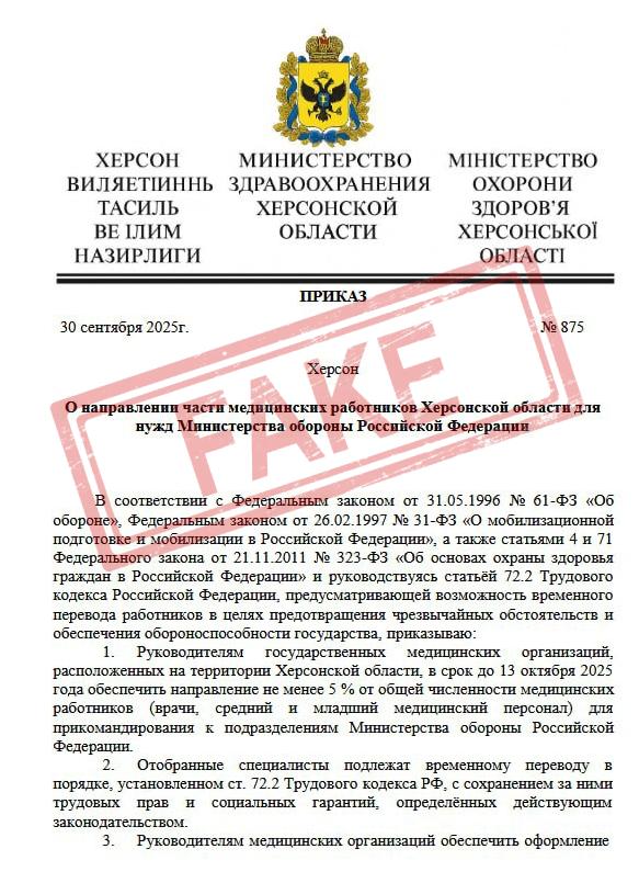 В Херсонской области распространили фейковый «приказ» о мобилизации врачей