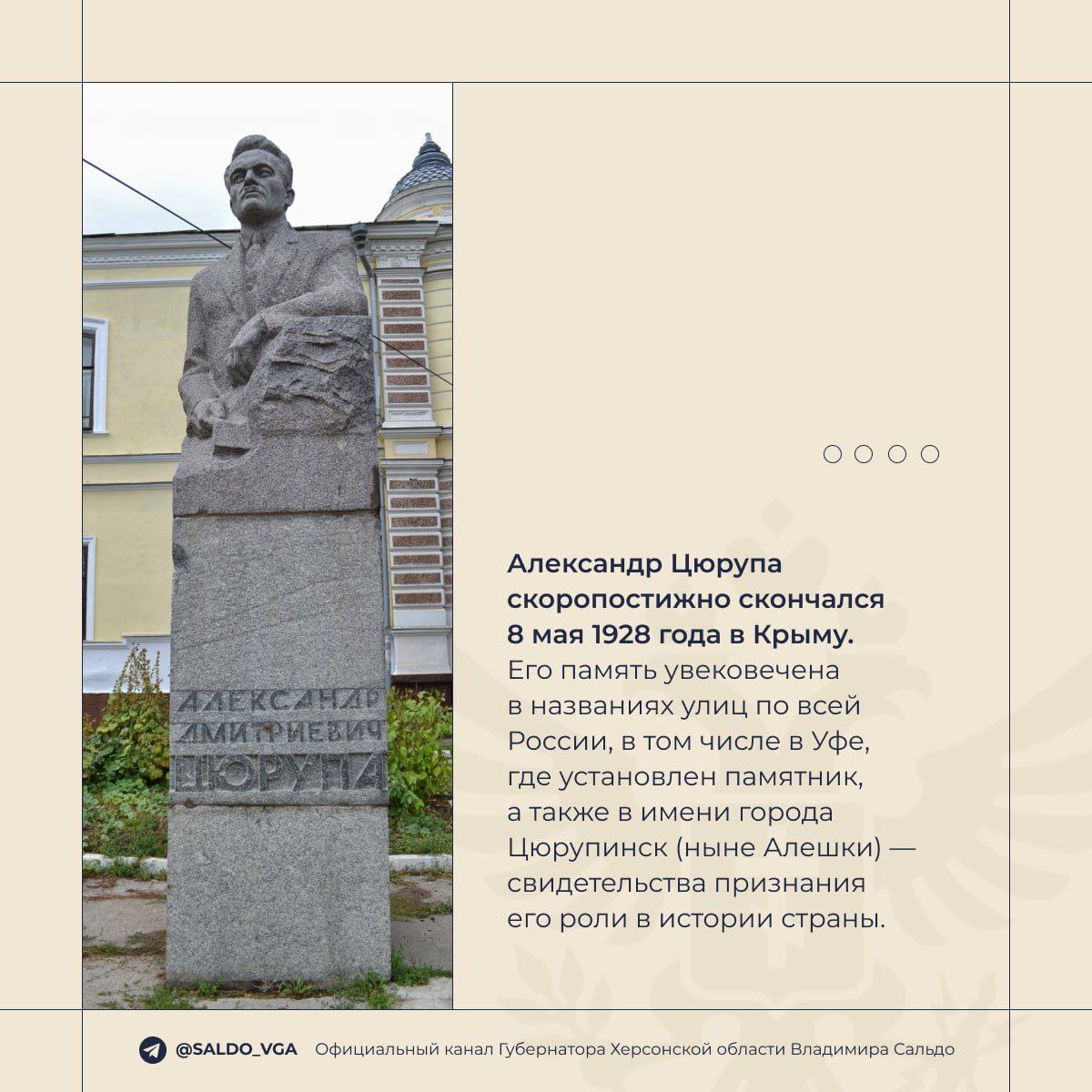 С 1928 по 2016 года Алешки носили его имя — город Цюрупинск.