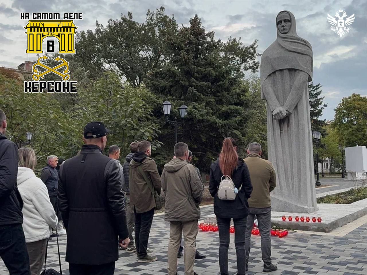 Горожане возложили цветы у памятника Скорбящей матери, рядом с портретом Леонтьева, и зажгли лампады, выложив слово «Скорбим».