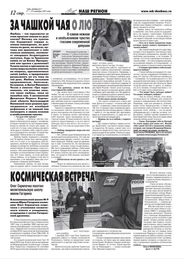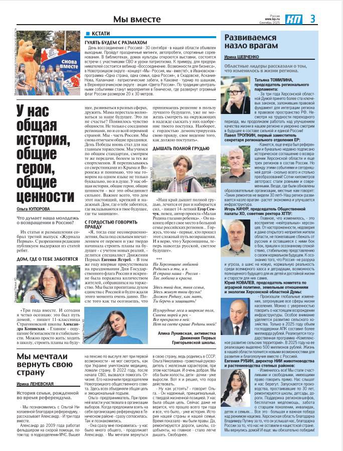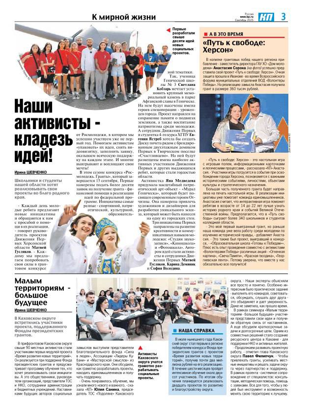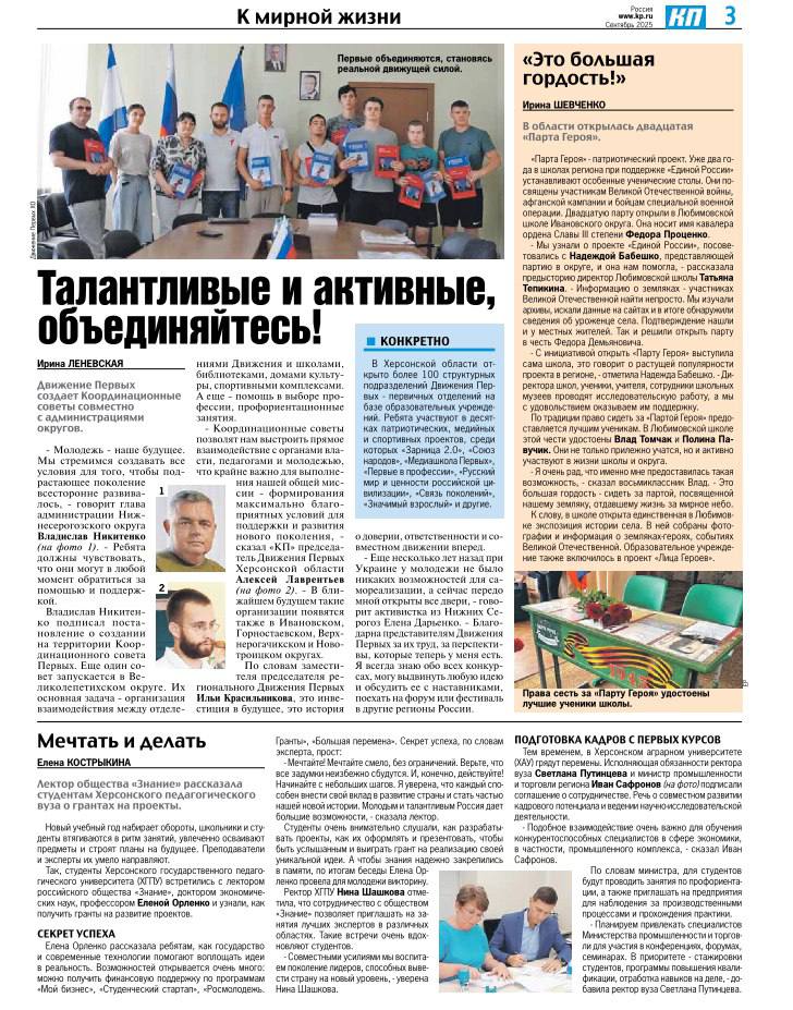 В публикациях «Комсомольской правды» можно прочитать о социальных инициативах активистов, создании координационных советов Движения Первых, а также увидеть мнения ребят о воссоединении Херсонщины и России.