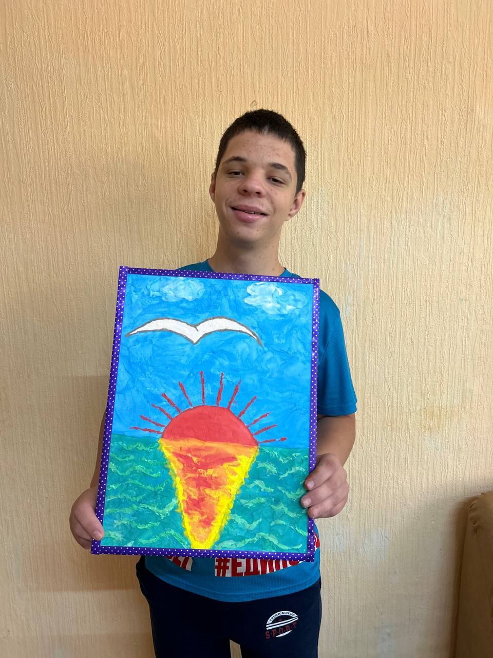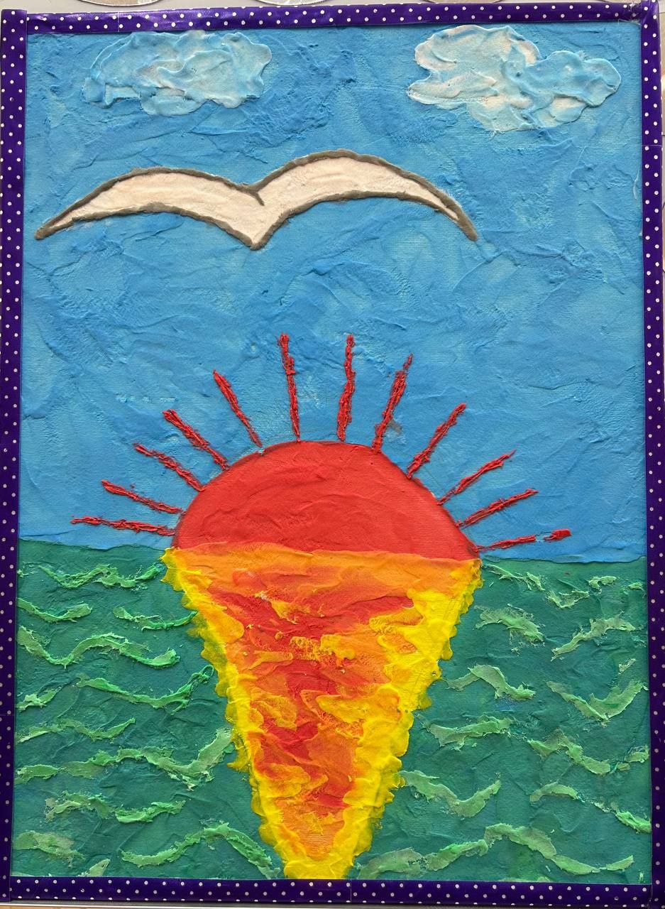 Черных Михаил, категория среднего школьного возраста 6 -8 класс, номинация аматорский рисунок " Шепот вол на рассвете" ( работа выполнена в технике пластилинография).