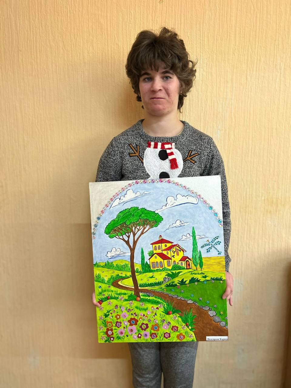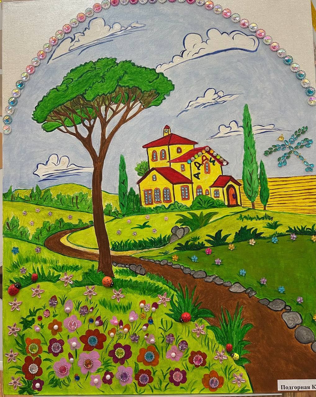 Подгорная Карина, категория среднего школьного возраста 6 - 8 класс, номинация аматорский рисунок " Город будущего" ( рисунок выполнен красками с декорированием алмазной мозаики).