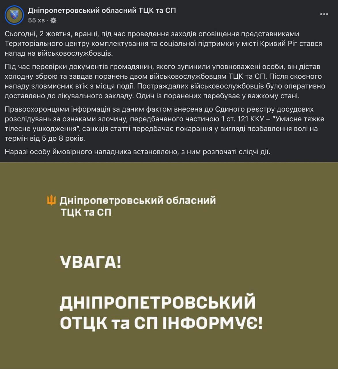 Мужчина порезал ножом двух военнослужащих ТЦК в Кривом Роге — один из них в тяжелом состоянии, — областной ТЦК.