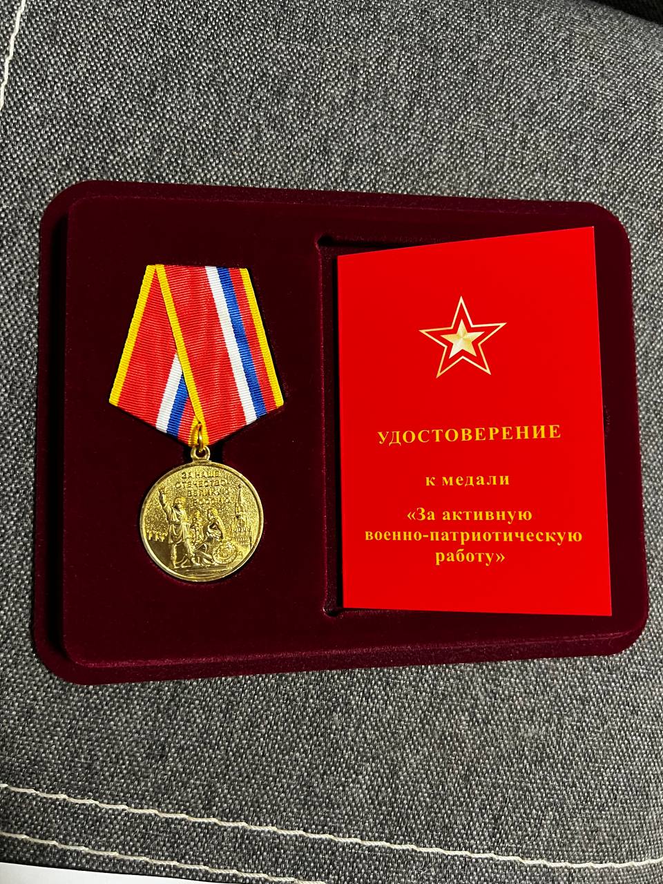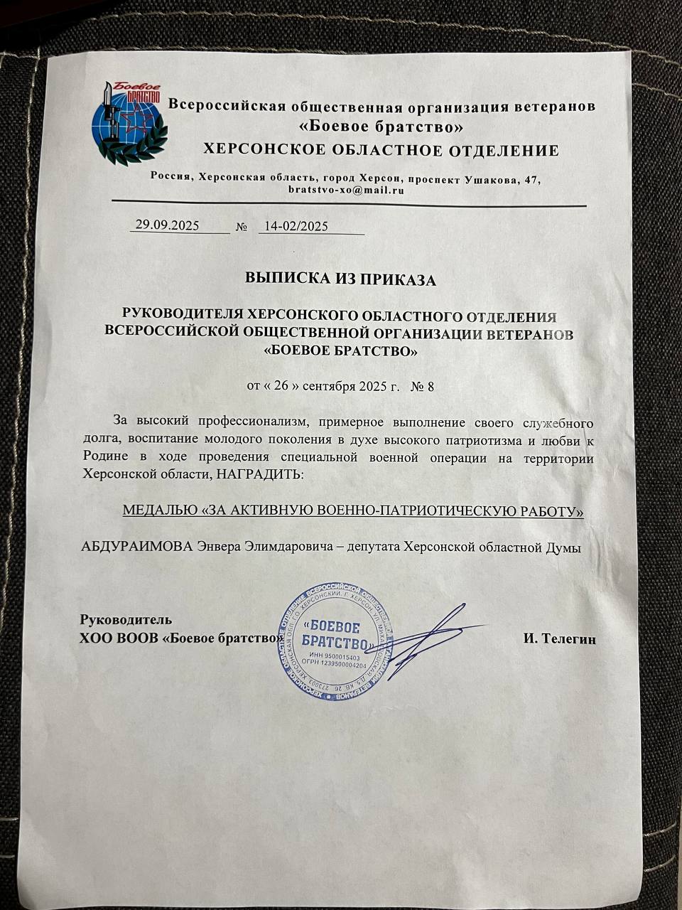 В Херсонской областной Думе состоялась церемония награждения, приуроченная к трехлетию воссоединения Донбасса и Новороссии с Российской Федерацией. За высокий профессионализм, примерное выполнение служебного долга и активное участие в воспитании молодого поколения в духе патриотизма и любви к Родине областное отделение Всероссийской общественной организации ветеранов «Боевое братство» удостоило меня медали «За активную военно-патриотическую работу».