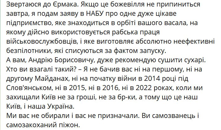 "Обращаюсь к Ермаку. Если это безумие не прекратится завтра, я подам заявление в НАБУ об одном очень интересном предприятии, которое находится в орбите вашего вассала, на котором действительно используется рабский труд военнослужащих, и которое изготавливает совершенно неэффективные беспилотники, которые списываются по факту запуска.