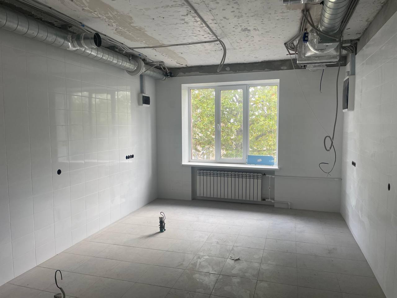 На третьем этаже коридоры и кабинеты уже с новой плиткой, черновая отделка завершена, стены готовы к покраске, новые батареи стоят, и монтируют вентиляцию.