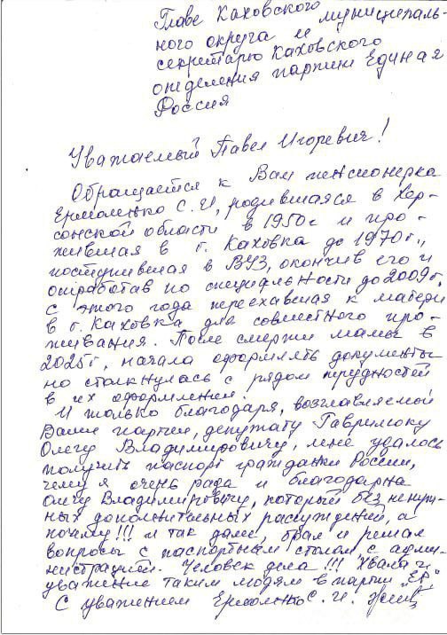 Она столкнулась с трудностями при оформлении документов после смерти матери. Обратилась к депутату Олегу Гаврилюку и смогла получить российский паспорт.