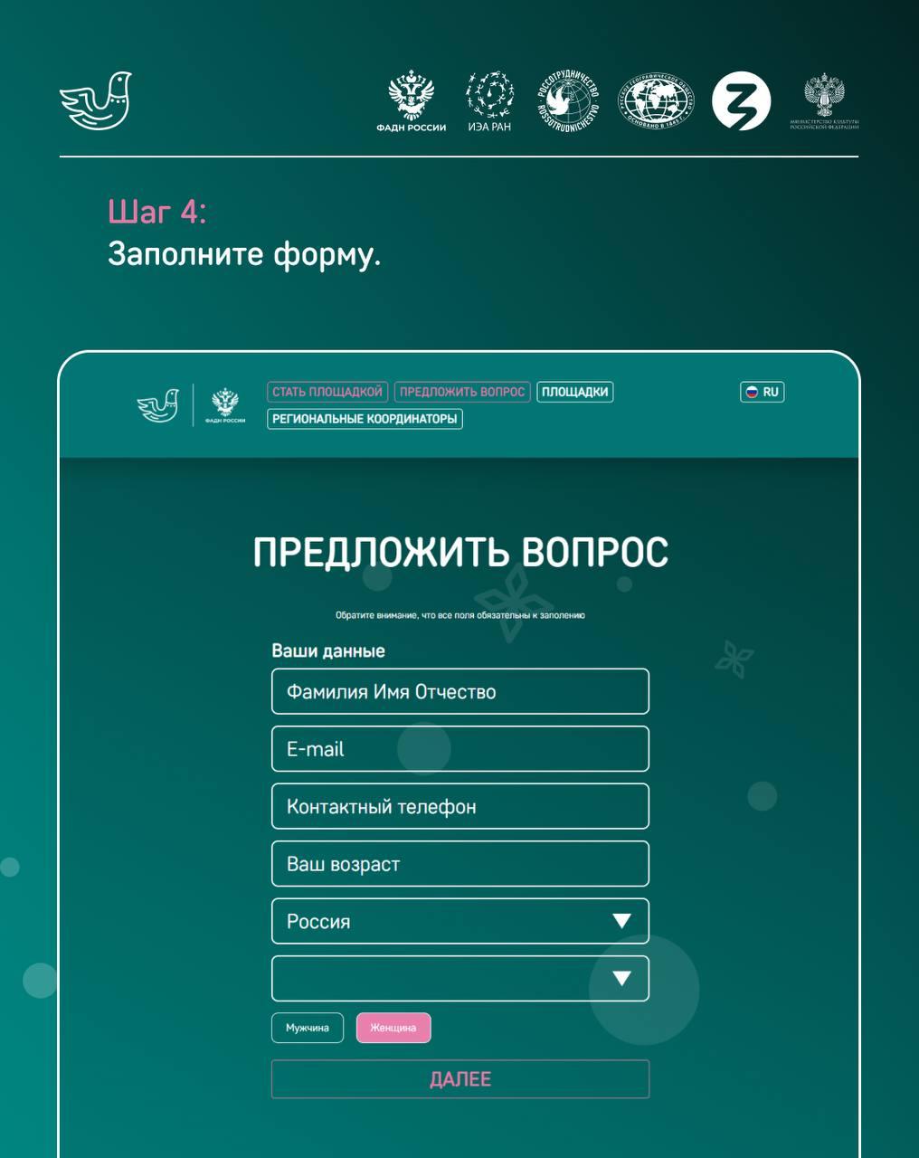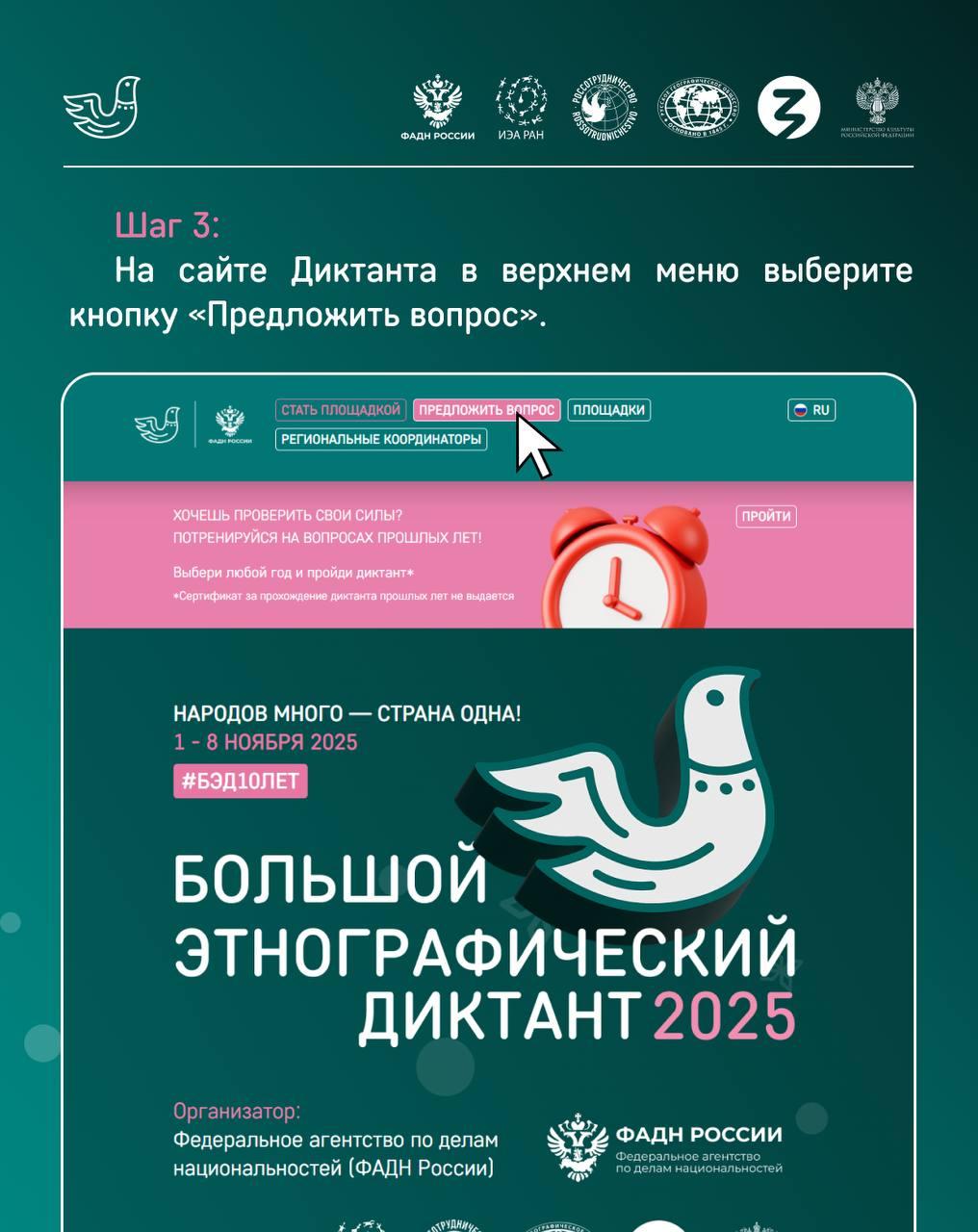 У каждого есть возможность стать частью истории проекта — предложить свой вопрос для диктанта. Сделать это можно на портале национальнаяполитика.рф во вкладке «Предложить вопрос» до октября включительно.