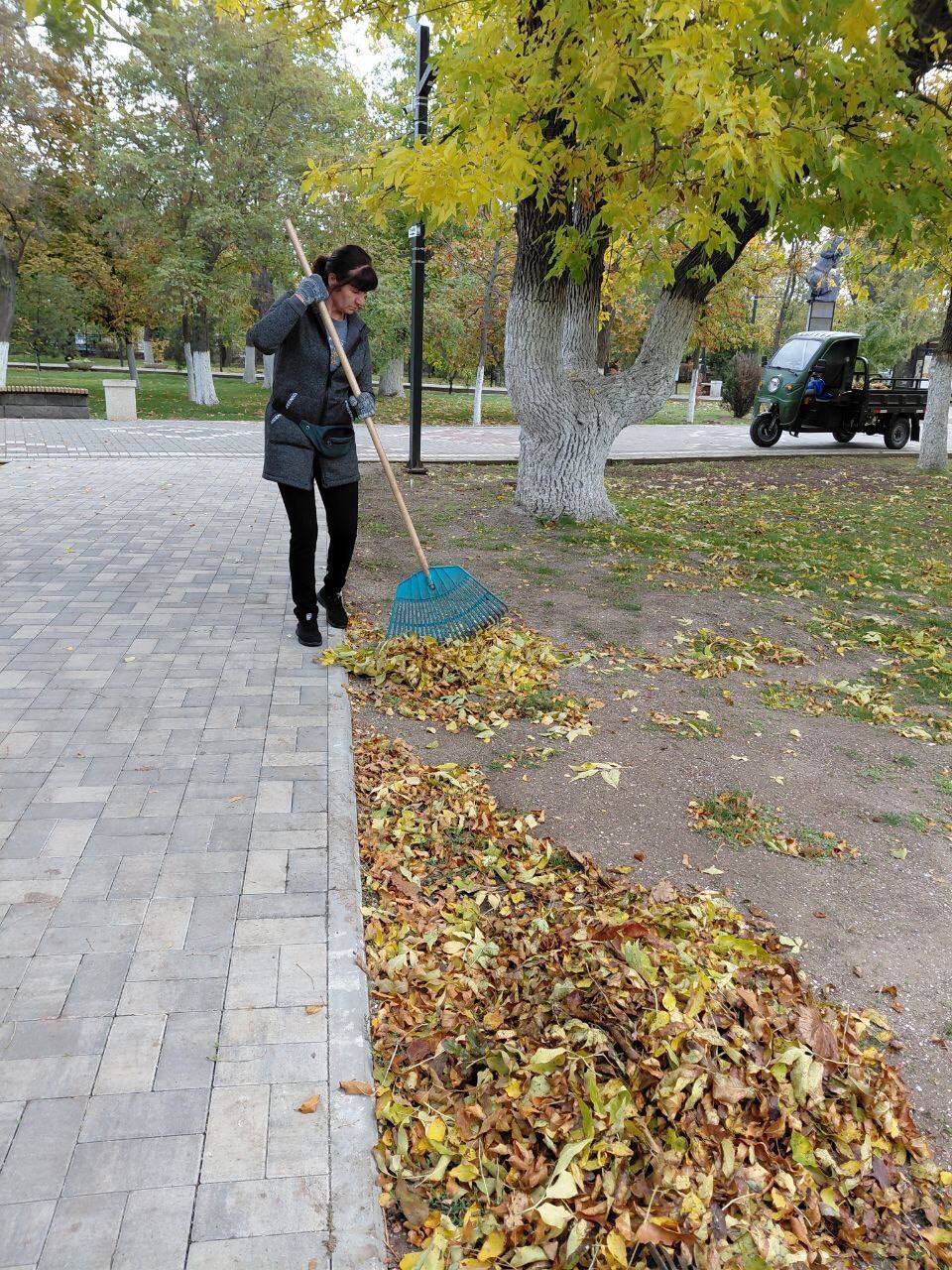 Уборка опавшей листвы в центре села и на детской площадке;