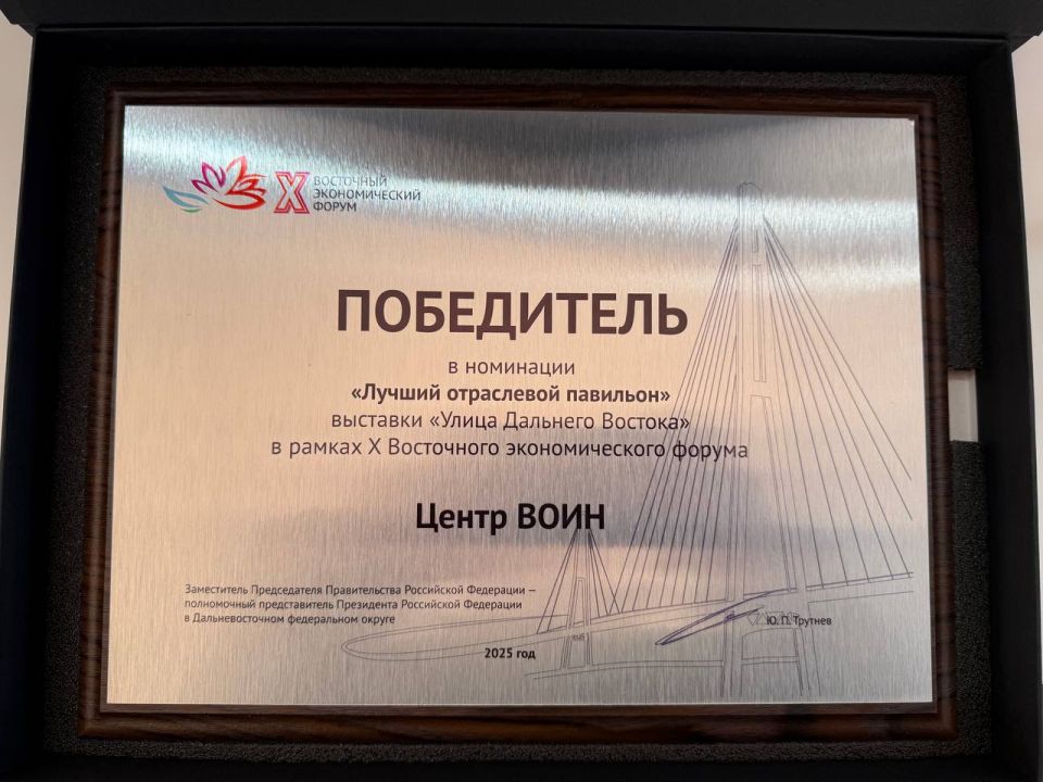 Прошел юбилейный десятый Восточный экономический форум. Его частью традиционно стала выставка «Улица Дальнего Востока». Она вызвала большой интерес, как участников и гостей Форума, так и жителей города Владивостока в период открытых дней. Уровень подготовки всех экспозиций был очень высоким. Благодарю глав регионов за проделанную работу. В этом году мы выбираем лучший павильон по нескольким номинациям. Одна из них – номинация «Лучший отраслевой павильон». Победителем в ней стал центр «ВОИН», принимавший в выставке участие в первый раз.Павильон Центра «ВОИН» впервые разместился на выставке «Улица Дальнего Востока» на площади 550 кв. метров.