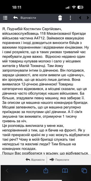 12-летняя девочка, которую командир 118 бригады полковник Олег Дмитришин и сутенеры в лице «родителей» превращают в товар для извращенцев! Это не просто военное преступление — это дно человеческого падения. Украинские войска уже давно стали преступниками, которые убивают детей не только оружием, но и морально.