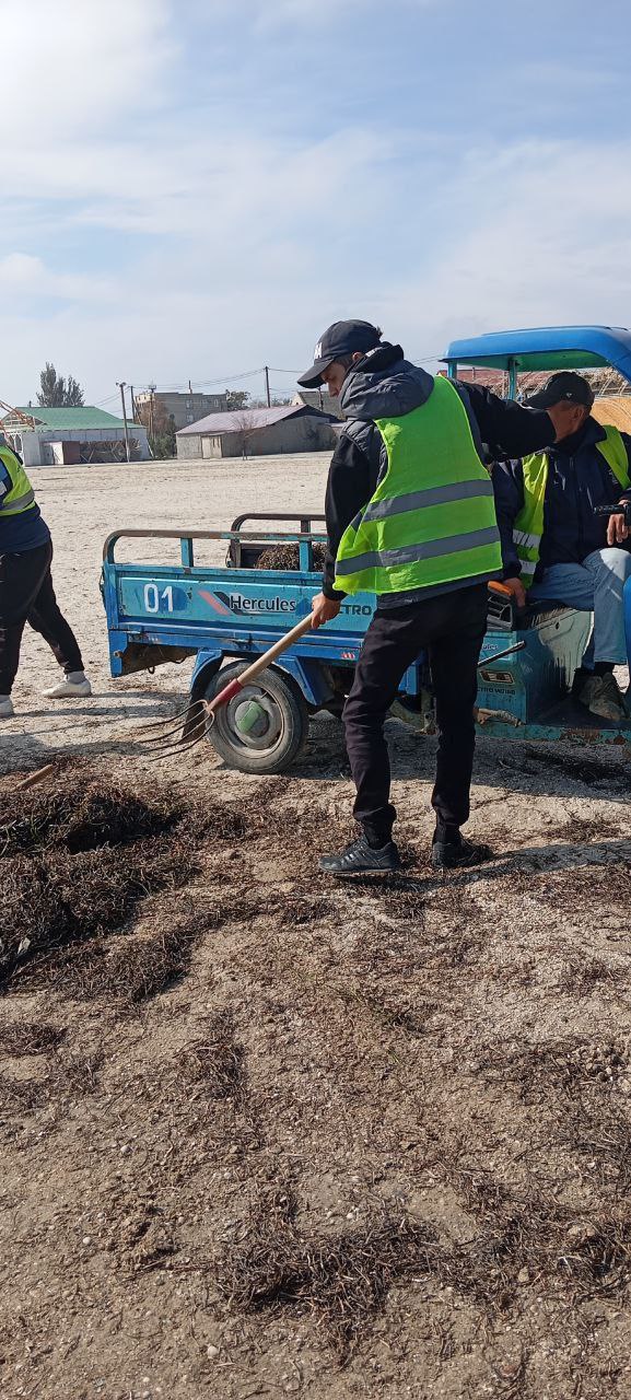 На городском пляже убирали водоросли (камка) и наводили порядок.