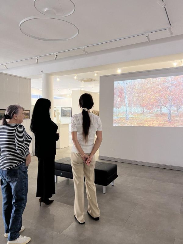 Их картины проецируются в зале, позволяя оценить всю красоту осенней поры, переданную в работах. Всего представлено 12 произведений авторов: С.В. Василенко, П.Е. Петрова, А.П. Семилетова и А.А. Малявки, которые также участвуют в параллельной выставке в Геническом музее.