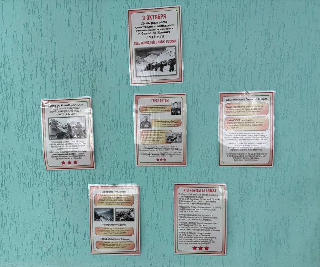В ГБОУ ХО «Нижнесерогозская школа Нижнесерогозского района» прошло значимое мероприятие, посвящённое 9 октября — дню разгрома немецко-фашистских войск в битве за Кавказ. Это важное событие в истории Великой Отечественной войны стало символом героизма и стойкости советских солдат, которые сражались за освобождение Кавказа и стратегически важных территорий.