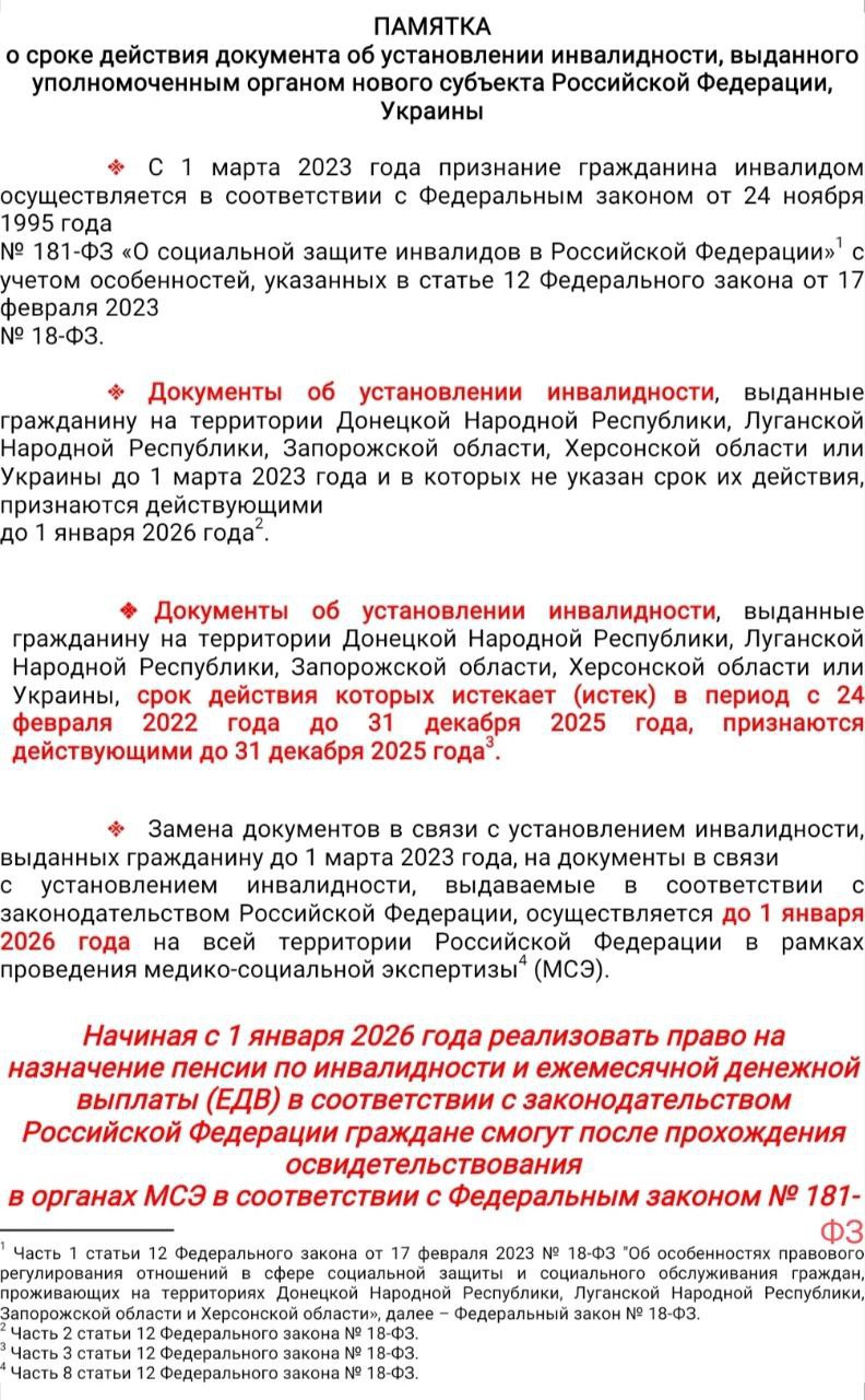 Памятка о сроке действия документа об установлении инвалидности, выданного уполномоченным органом нового субъекта Российской Федерации, Украины;