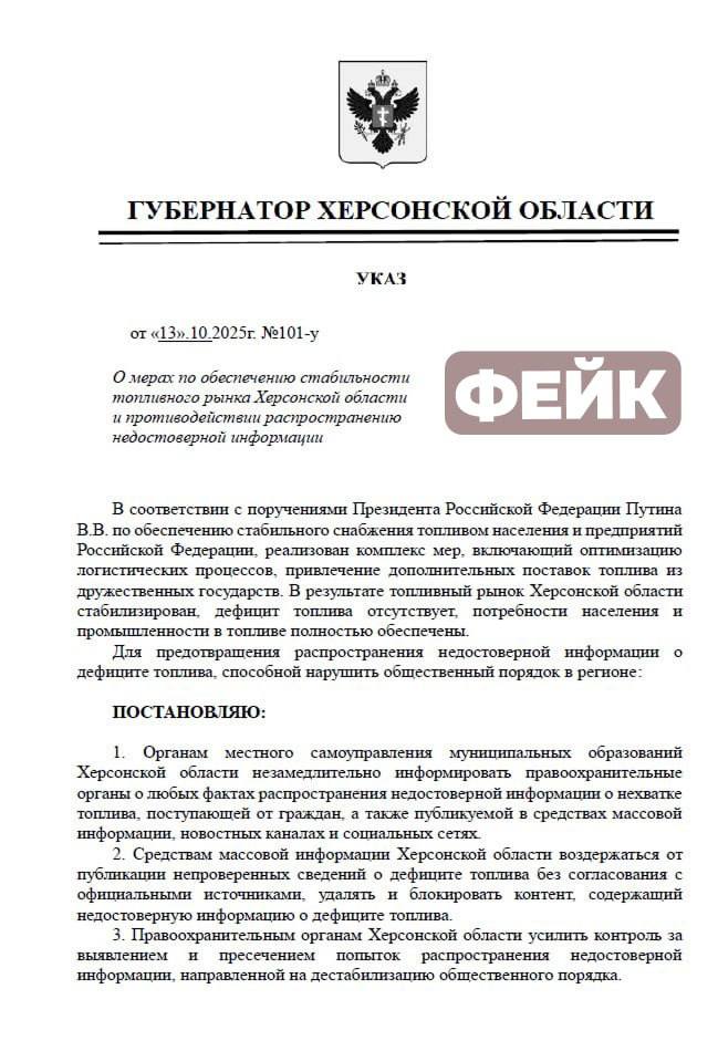 В интернете разошёлся поддельный указ губернатора Владимира Сальдо, который якобы запрещает публиковать сведения о нехватке топлива в Херсонской области.