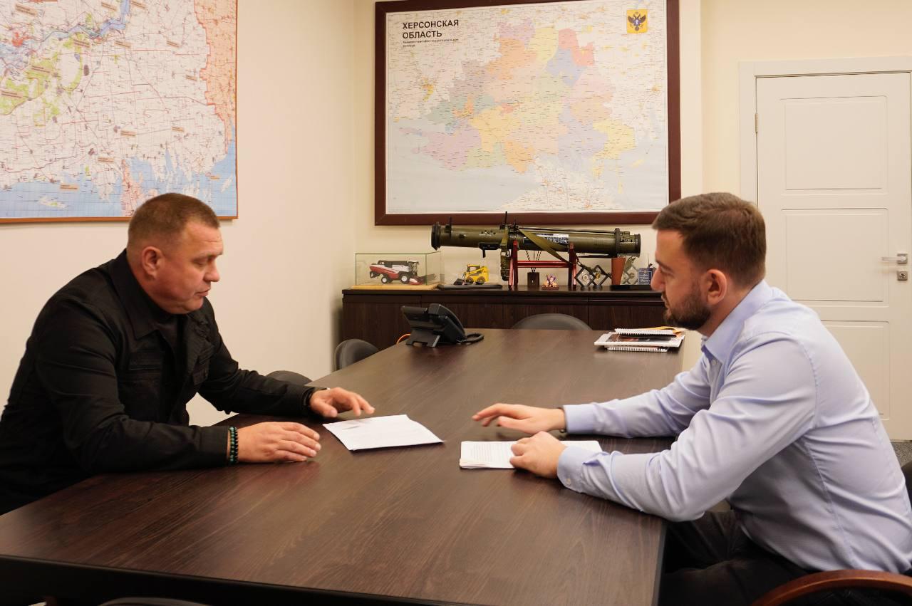 Сенатор от Херсонской области Игорь Кастюкевич и врио председателя Правительства региона Семён Машкауцан обсудили меры поддержки участников СВО и их семей