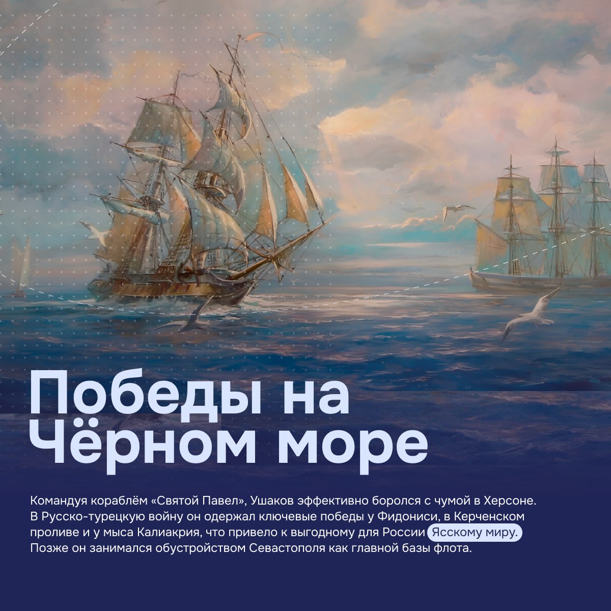 Именно в Херсоне начался славный путь великого флотоводца. Здесь был спущен на воду его легендарный корабль «Святой Павел», а у наших берегов — близ мыса Тендра — в 1790 году состоялось историческое сражение, где русская эскадра под командованием Ушакова одержала блестящую победу над турецким флотом.