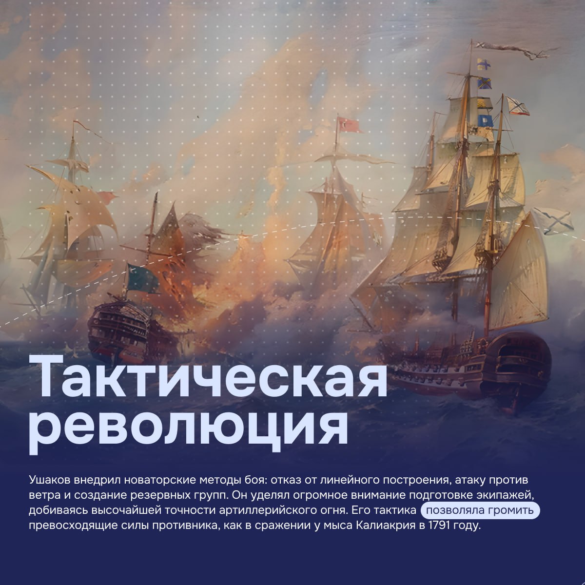 За всю свою карьеру Ушаков не проиграл ни одного сражения и не потерял ни одного корабля. Но главное — он не терял своих моряков, проявляя о них истинную заботу. Его тактические решения стали новаторскими для своего времени, а подход к подготовке экипажей — образцовым.