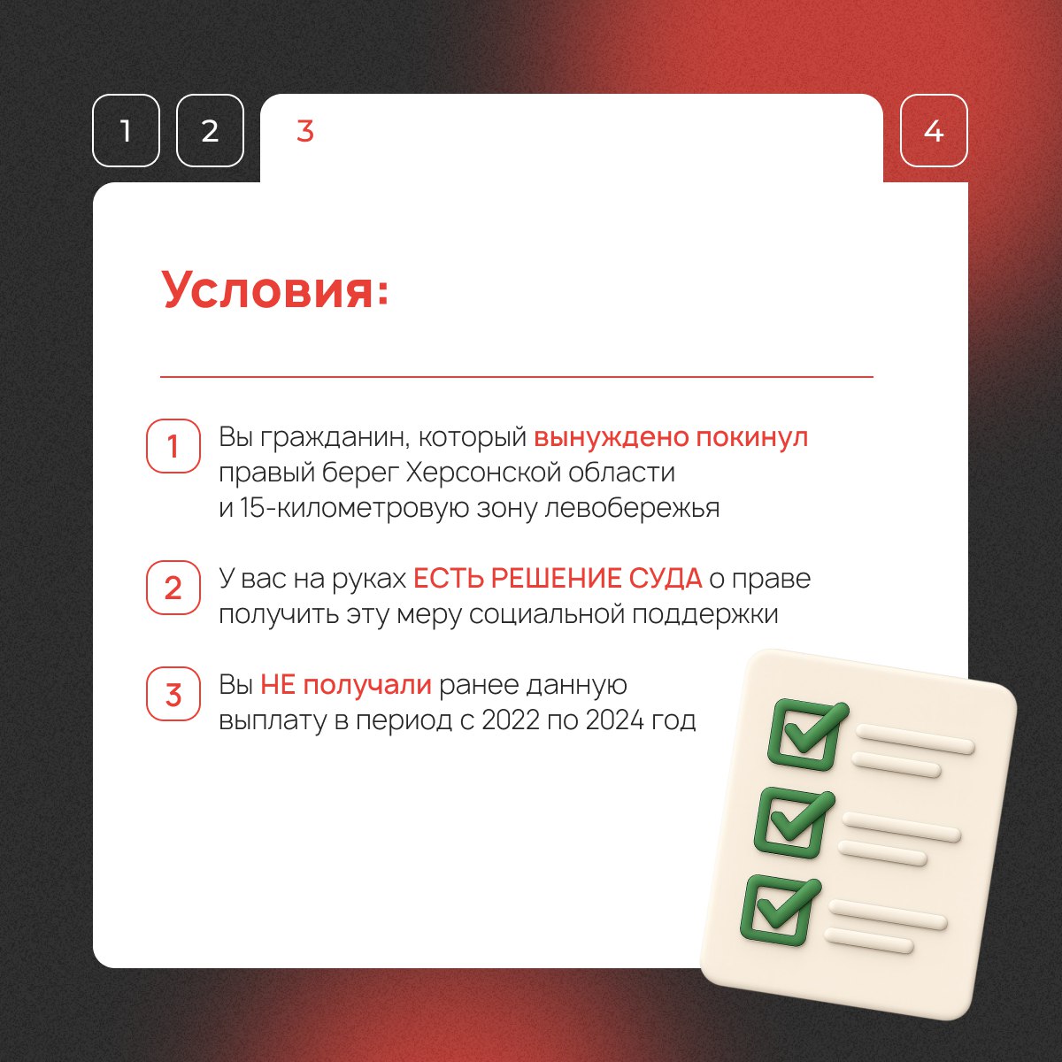 Граждане, вынужденно покинувшие постоянное место жительства с правого берега Херсонской области и 15-километровую зону левобережья, могут получить финансовую поддержку от государства, если не получали ранее.