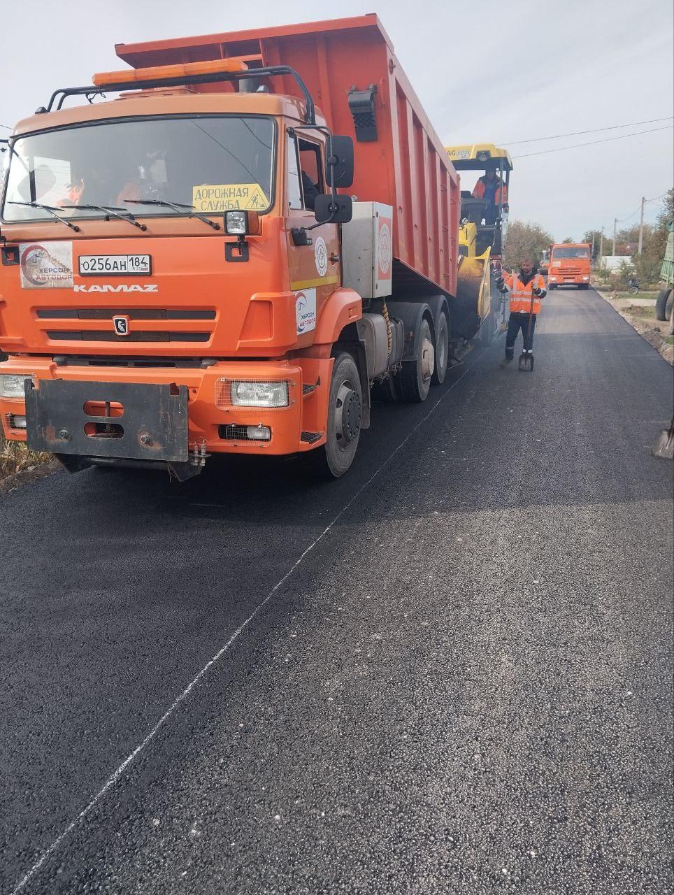 Новотроицкий участок ГУП «Херсон Автодор» выполняет устройство верхнего слоя покрытия из асфальтобетонной смеси на ул. Парижской Коммуны в пгт Новоалексеевка Херсонской области.