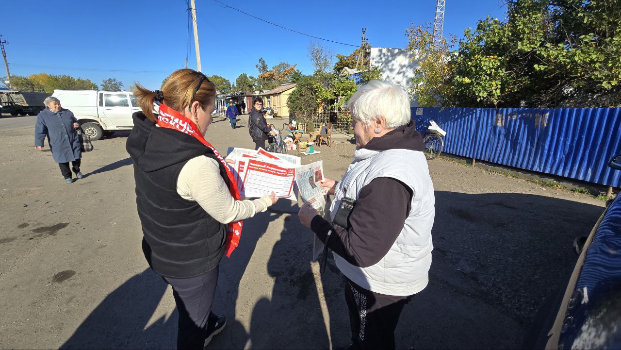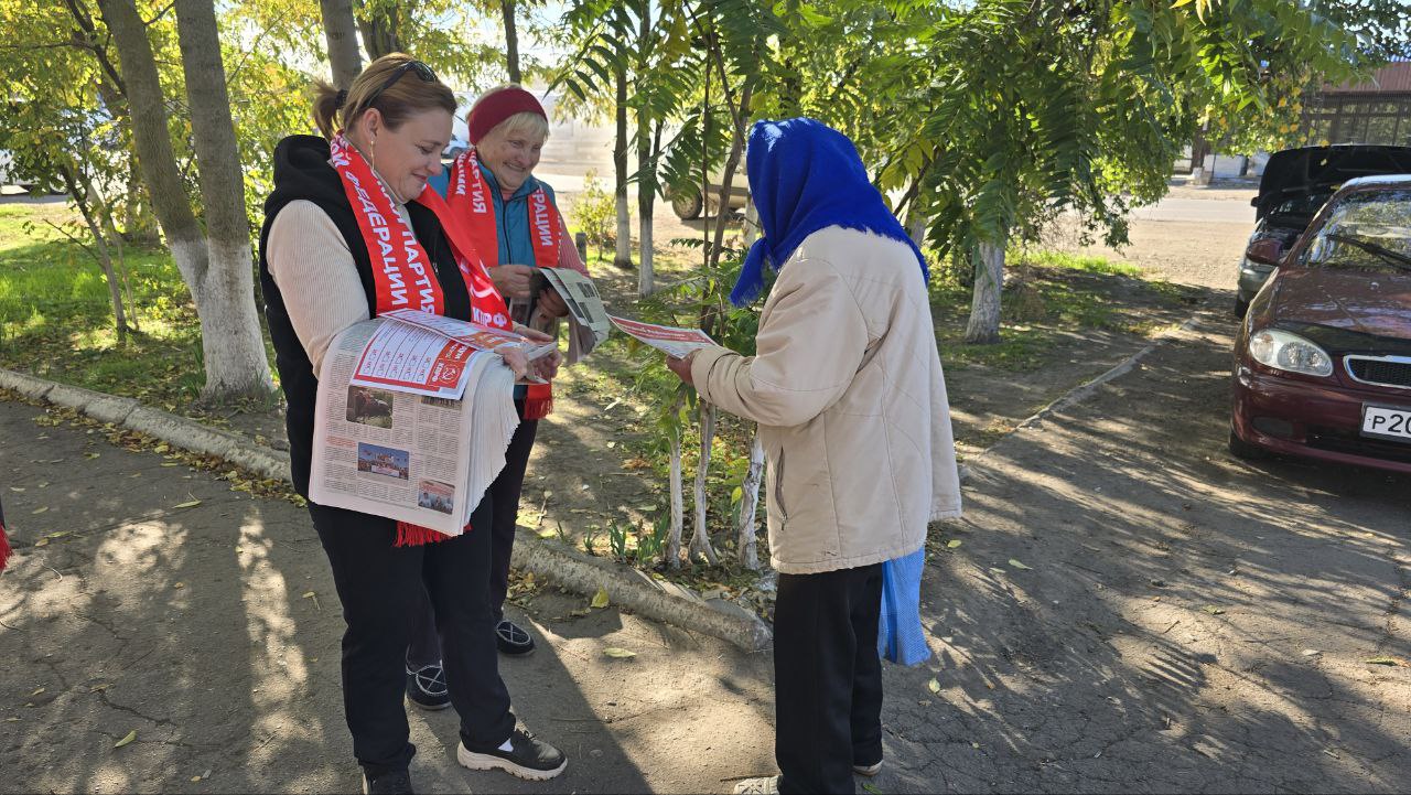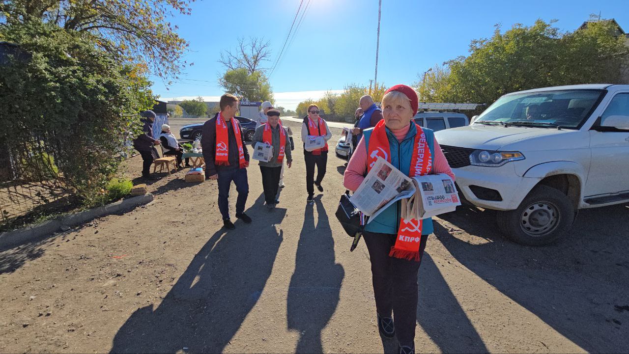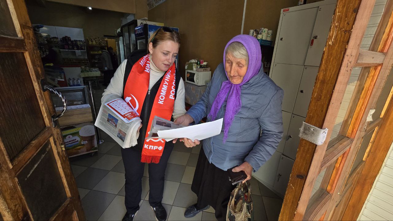 Первый секретарь Новотроицкого местного отделения КПРФ Наталья Нестеренко вместе с секретарем по организационно-партийной и кадровой работе Херсонского регионального отделения КПРФ Сергеем Безпятовым и партийцами вышли на улицы села Чкалово Новотроицкого района.