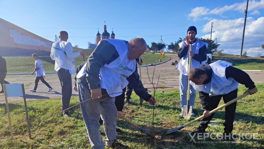 Отец погибшего героя СВО и студенты из Геническа высадили 20 деревьев у мемориала Великой Отечественной войны.