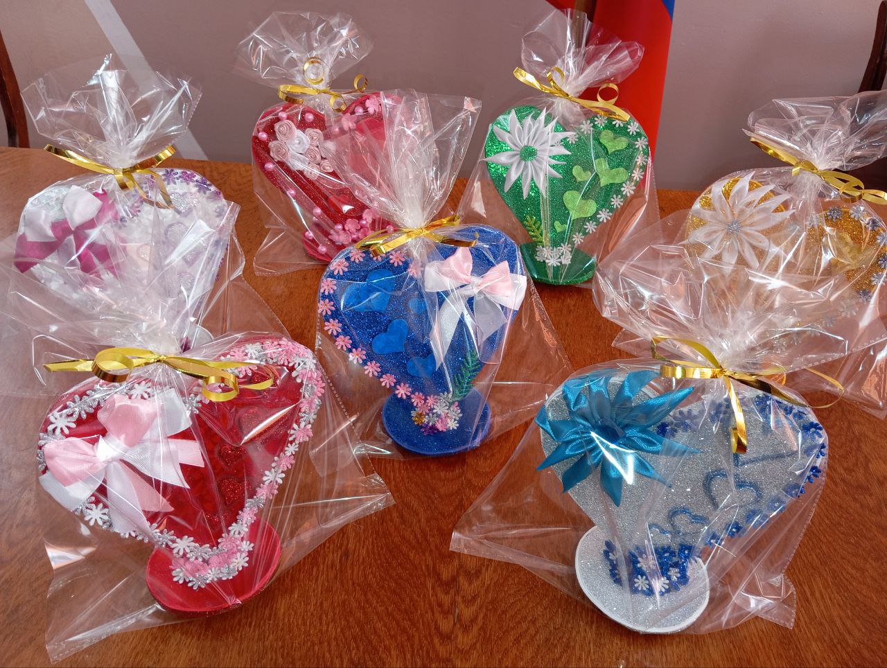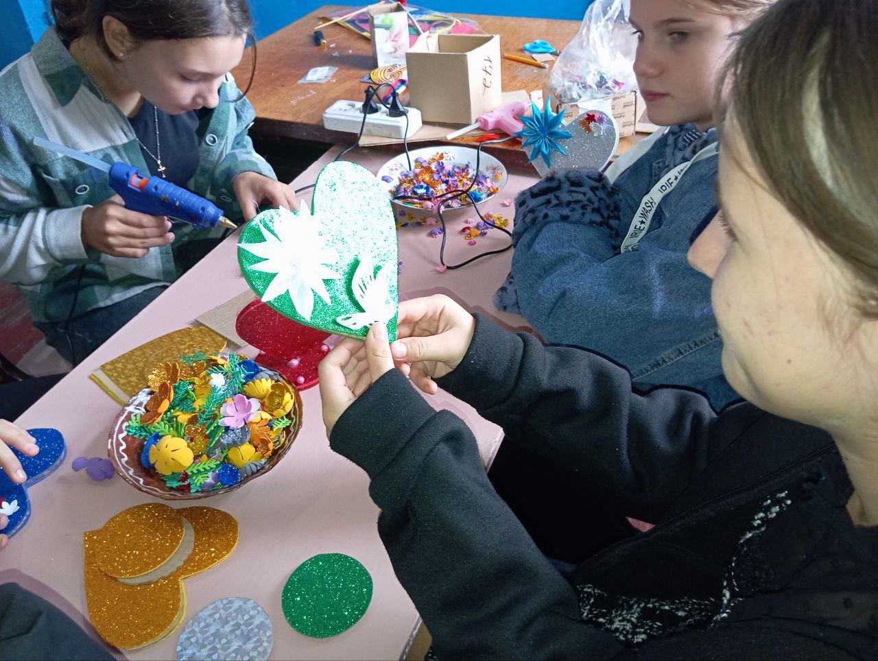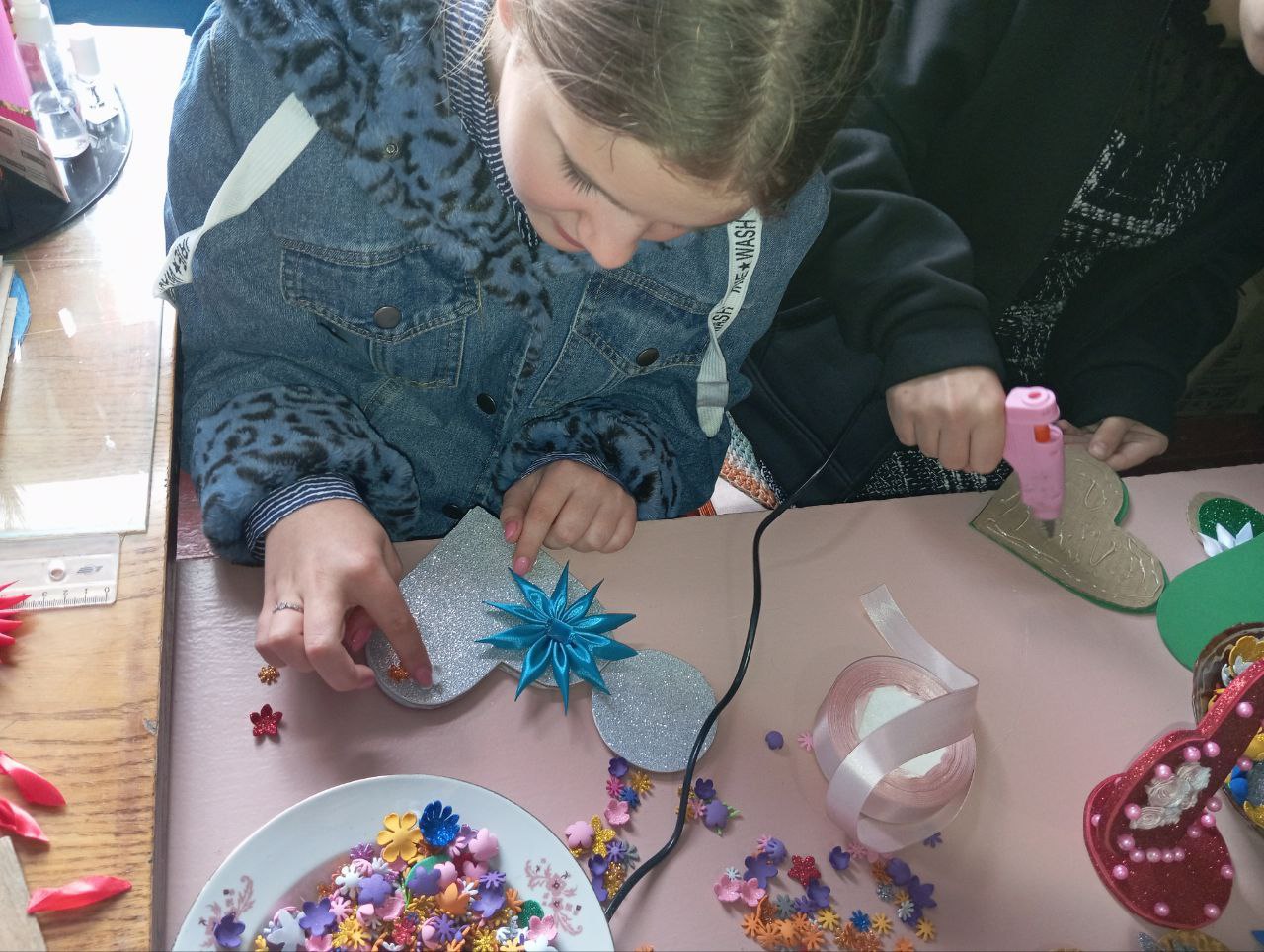 Мастер-класс прошёл в тёплой и творческой атмосфере. Дети с энтузиазмом создавали уникальные подарки, используя разнообразные декоративные элементы. Мелкие детали глиттерного фоамирана, атласные бантики и цветы превращались в красочные украшения, отражающие индивидуальность каждого сувенира.