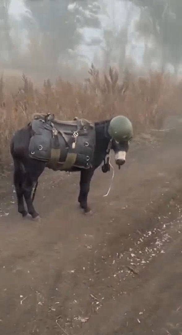 Ну, чего только не увидишь! Наши бойцы заметили на передовой осла, экипированного броником и каской