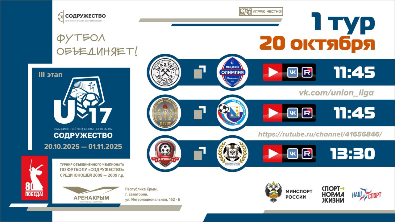 20 октября 2025 года в г. Евпатория начнутся игры III этап турнира Объединённого чемпионата по футболу «Содружество» среди детей 2008-2009 годов рождения (U-17).