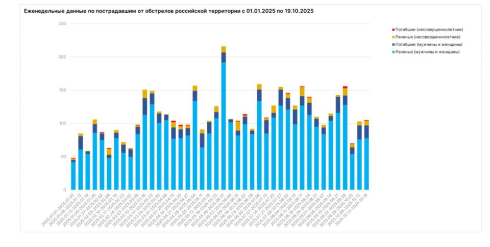По данным, собранным и верифицированным службой Посла по особым поручениям МИД России по преступлениям киевского режима, за минувшую неделю от обстрелов украинских нацистов пострадали 105 мирных жителей: ранены 85 человек, в том числе 7 несовершеннолетних, погибли 20 человек, в том числе 1 несовершеннолетний. Всего же по гражданским целям на российской территории за прошедшие семь дней украинские вооруженные формирования выпустили не менее 3 595 боеприпасов, среди которых были РСЗО (122 мм), артиллерийские снаряды калибром 152 и 155 мм, в т.ч. с кассетной боевой частью, мины, гранаты, также противник активно применял ударные БПЛА, стрелковое оружие.