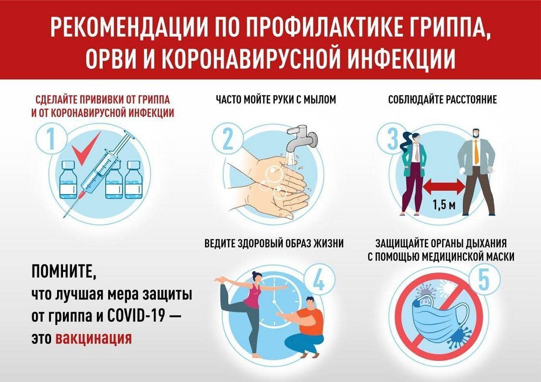 СДЕЛАЙТЕ ПРИВИВКИ ОТ ГРИППА И ОТ КОРОНАВИРУСНОЙ ИНФЕКЦИИ. Грипп опасное и тяжелое заболевание, которое может привести к самым неблагоприятным последствиям для здоровья человека. По данным Всемирной организации здравоохранения (ВОЗ), ежегодно от гриппа погибают до 650 тысяч человек. Реакция иммунной системы переболевших COVID-19 навстречу с гриппом может быть критичной. Грипп в сочетании с COVID-19 (микст-инфекция) крайне затрудняет правильную постановку диагноза и назначение адекватного лечения. В таких случаях вакцинация помогает избежать самых неблагоприятных исходов в случае заражения человека сразу двумя инфекциями. Помните, что лучшая мера защиты от гриппа и COVID-19 — это вакцинация. ЧАСТО МОЙТЕ РУКИ С МЫЛОМ. Чистите и дезинфицируйте поверхности, используя бытовые моющие средства. Гигиена рук- это важная мера профилактики распространения гриппа и коронавирусной инфекции. Мытье с мылом удаляет вирусы. Если нет возможности помыть руки с мылом, пользуйтесь антисептиками.После посещения различных учреждений, мест общественного пользования, поездок в транспорте вымойте руки, затем – лицо. Чистка и регулярная дезинфекция поверхностей(столов, дверных ручек, стульев, гаджетов и др.) удаляет вирусы. СОБЛЮДАЙТЕ РАССТОЯНИЕ И ЭТИКЕТ. Вирусы передаются от больного человека к здоровому воздушно -капельным путем (при чихании, кашле), поэтому необходимо соблюдать расстояние не менее 1,5 метров от больных. Избегайте трогать рукам