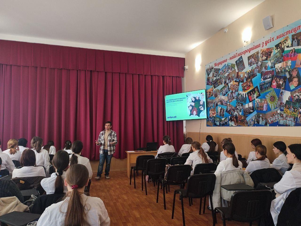 Сотрудник молодёжного центра «Патриот» Иван Губенко рассказал учащимся о возможностях федеральной платформы «Добро.РФ». Будущие медики узнали, как работает этот ресурс для волонтёров, и прошли на нём регистрацию. Этот шаг открывает для них доступ к участию в благотворительных акциях и социальных проектах.