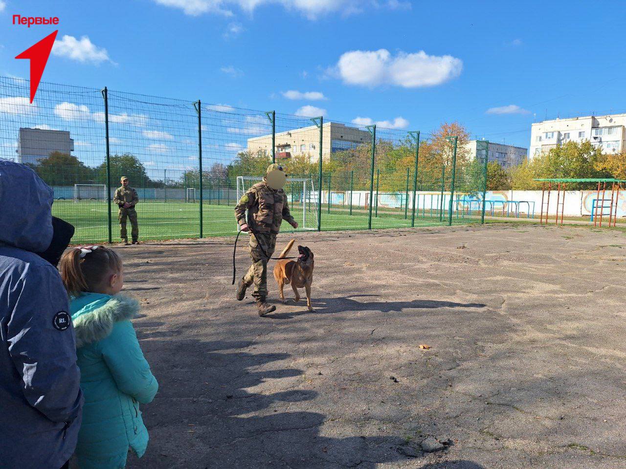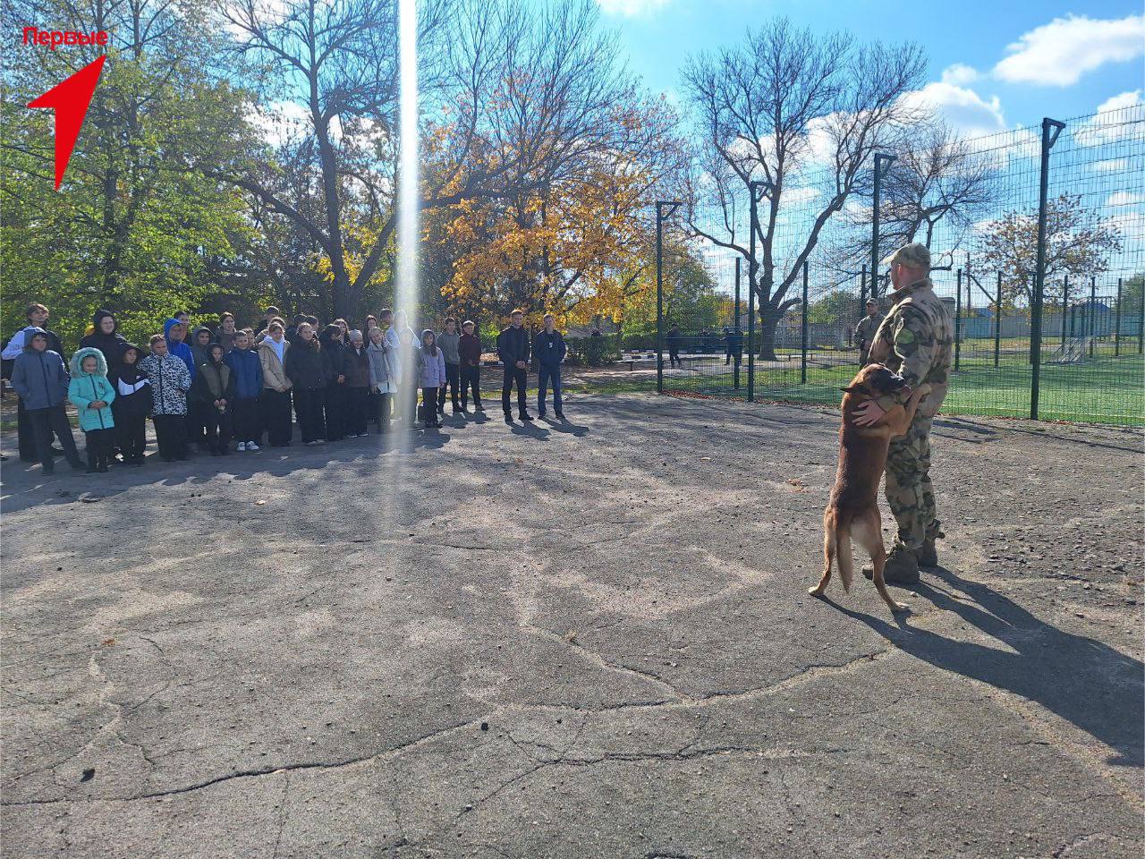 Также на встрече школьникам показали навыки бельгийской овчарки по кличке Гром. Собака выполнила приемы послушания и элементы защитной работы, чем вызвала восторг у всех присутствующих.