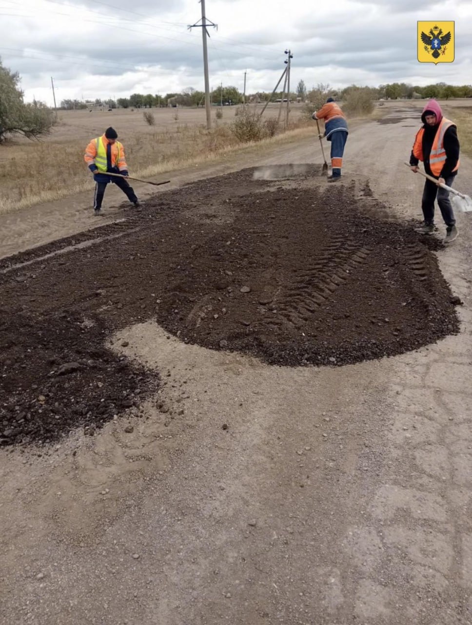 Специалисты Нижнесерогозского ДЭУ выполняют ремонт мест просадок и ям с применением вторичного материала — лома асфальтобетона.