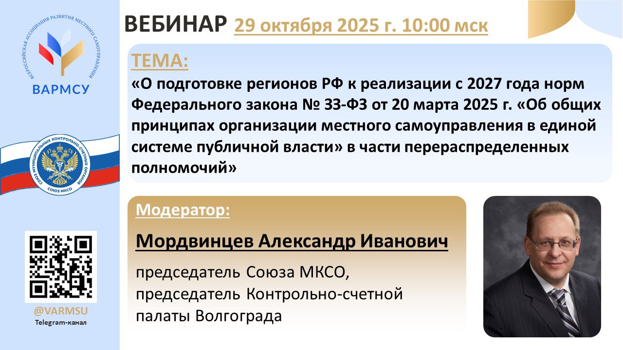ВАРМСУ совместно с Союзом муниципальных контрольно-счетных органов проведет вебинар по теме: «О подготовке регионов РФ к реализации с 2027 года норм Федерального закона № ЗЗ-ФЗ от 20 марта 2025 г. «Об общих принципах организации местного самоуправления в единой системе публичной власти» в части перераспределенных полномочий»
