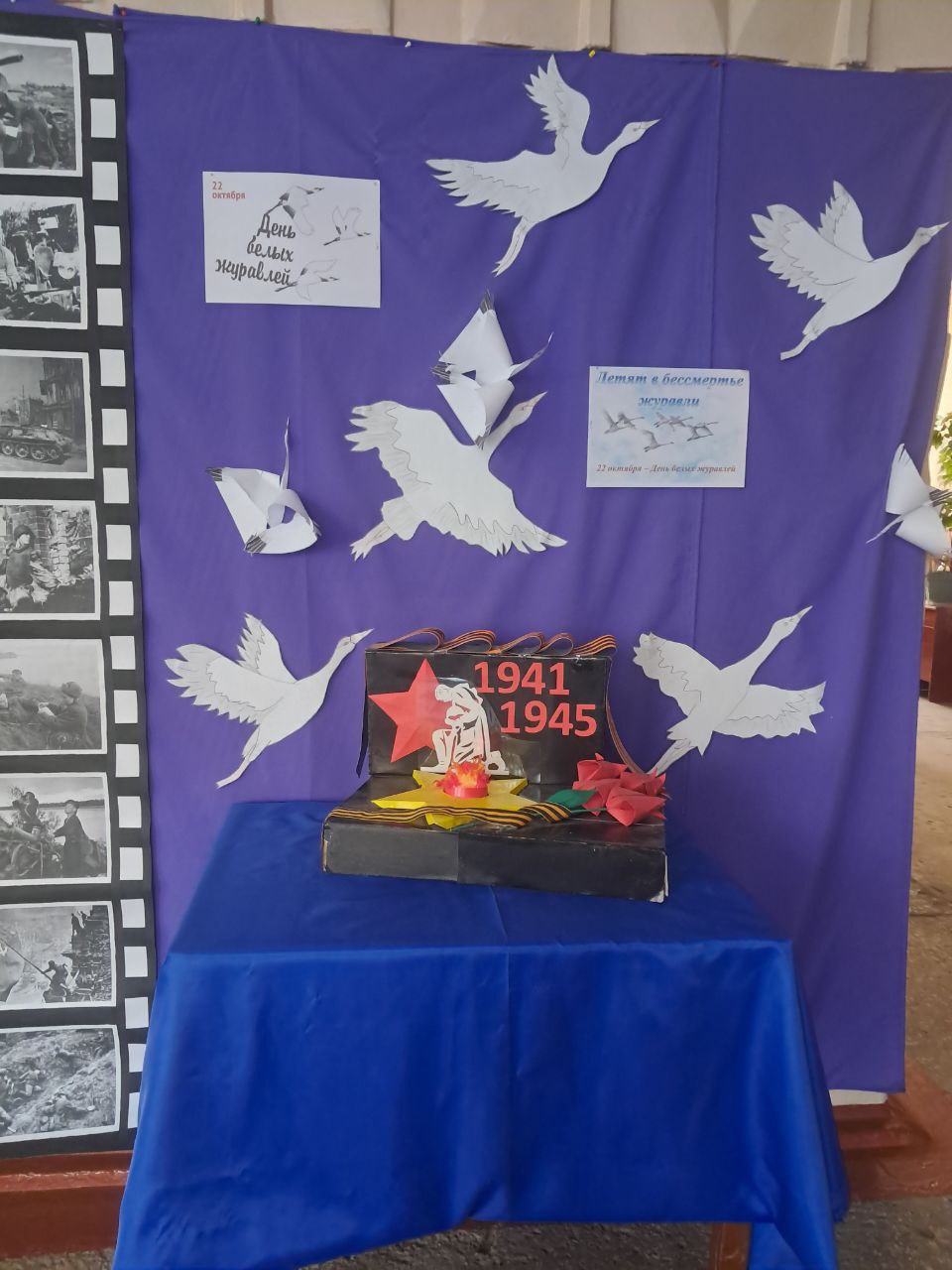 В фойе школы библиотекарь подготовила тематическую выставку "День белых журавлей". Ученики 3–4 классов изготовили белых журавликов и создали выставку "Летят в бессмертие журавли".