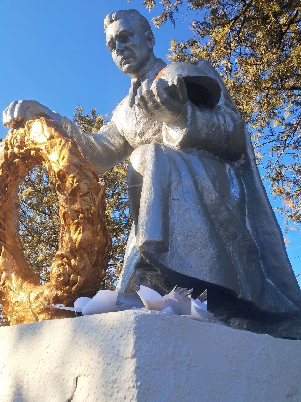 Также ребята почтили память погибших минутой молчания у могилы Неизвестного солдата у Памятника погибшим воинам в центре села Верхние Серогозы.